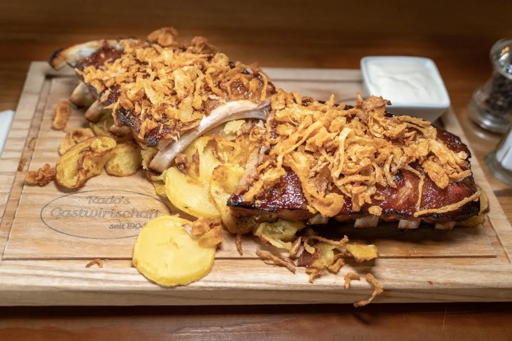 Das Rezept unserer Spareribs bleibt im Besitz der Familie Rado. Unsere Gäste erfreuen sich jedes Mal wieder über die „Spezialität des Hauses“. Angefangen bei der hausgemachten Marinade bis zum saftigen Fleisch welches sich herrlich vom Knochen löst.