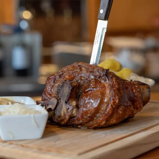 Eine weitere Spezialität unserer Familie ist die knusprige Stelze. Diese wird in unserem Hause klassisch mit Krautsalat, Ölpfefferoni, Senf, Hausbrot und frisch gerissenem Kren serviert.